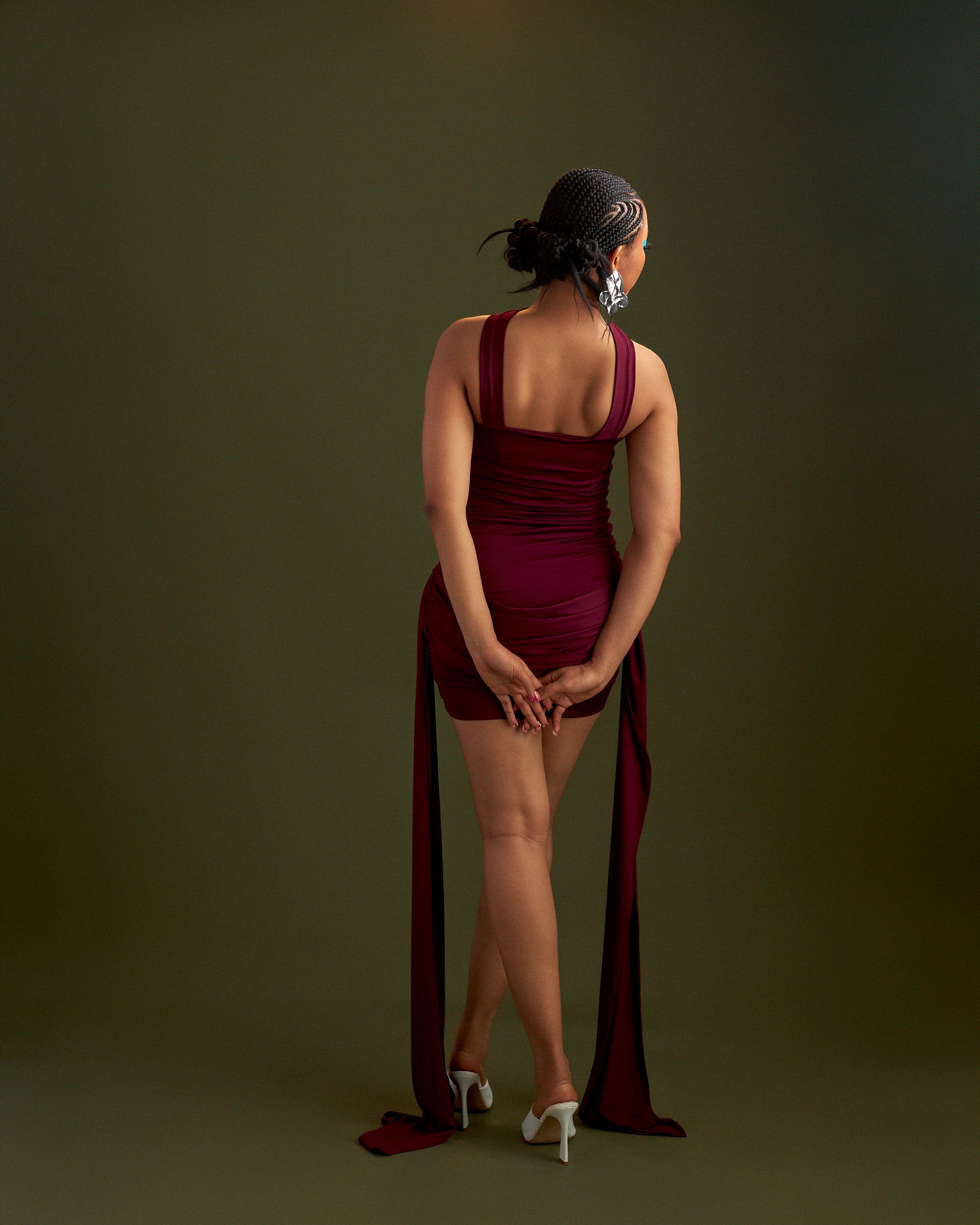 A tube mini dress crafted in sleek spandex with flattering ruching, featuring a neck strap that wraps delicately from the front to the back. Two dramatic tails flow from each hip, creating movement with every step.